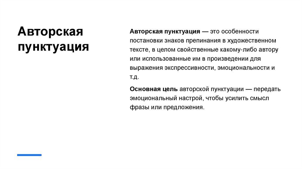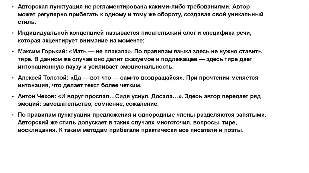• Авторская пунктуация не регламентирована какими-либо требованиями. Авторможет регулярно прибегать к одному и тому же обороту, создавая свой уникальный