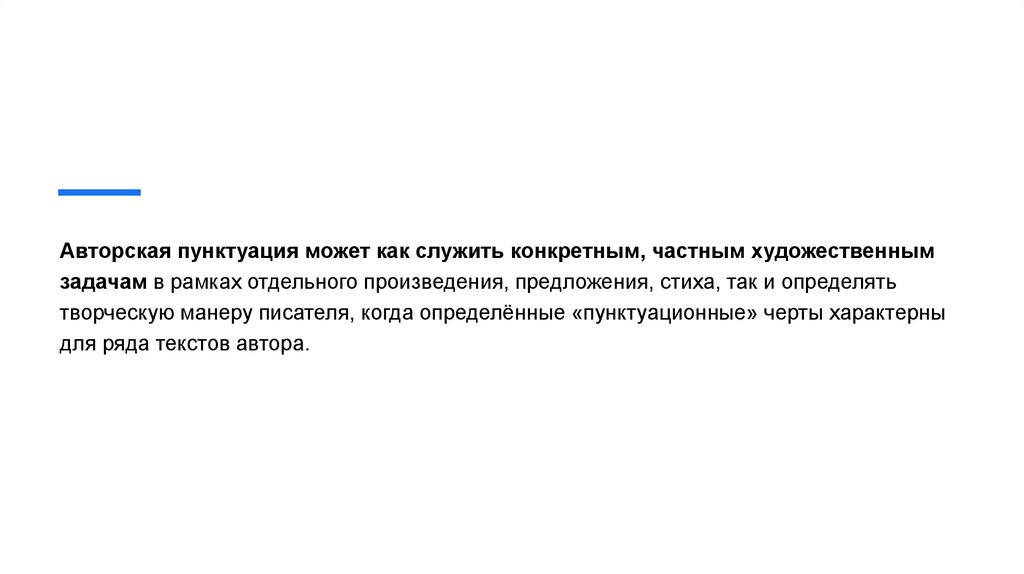 Авторская пунктуация может как служить конкретным, частным художественнымзадачам в рамках отдельного произведения, предложения, стиха, так и определять