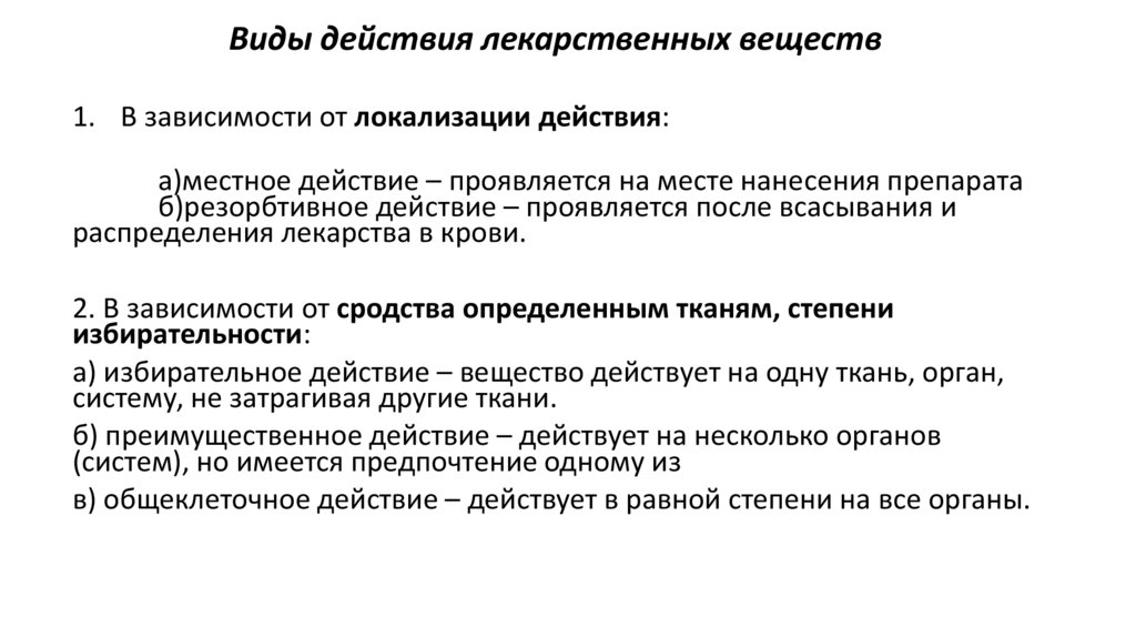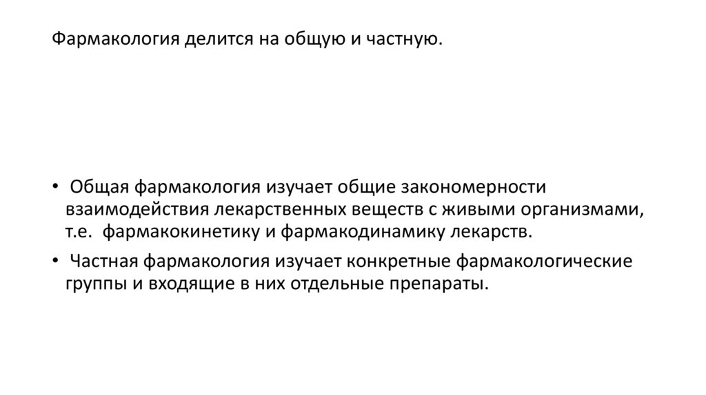 Фармакология делится на общую и частную.• Общая фармакология изучает общие закономерности