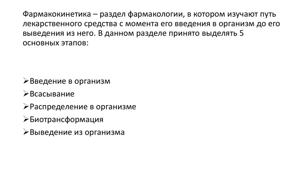 Фармакокинетика – раздел фармакологии, в котором изучают путьлекарственного средства с момента его введения в организм до его