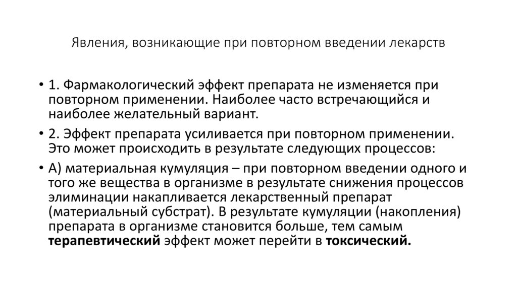 • А) материальная кумуляция – при повторном введении одного и