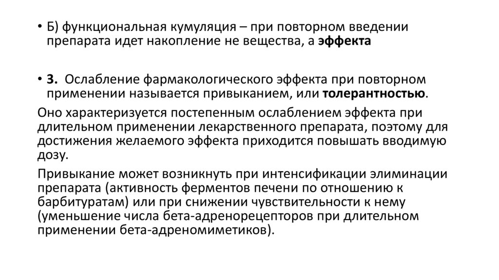 • Б) функциональная кумуляция – при повторном введениипрепарата идет накопление не вещества, а эффекта