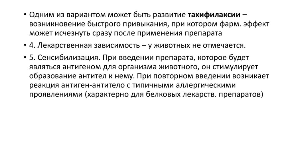 • Одним из вариантом может быть развитие тахифилаксии –возникновение быстрого привыкания, при котором фарм. эффект