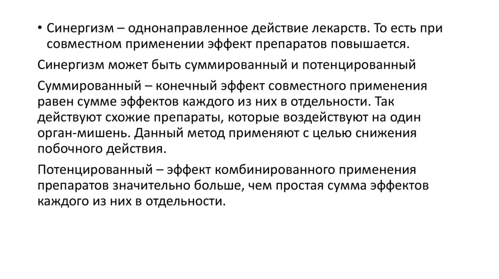 • Синергизм – однонаправленное действие лекарств. То есть присовместном применении эффект препаратов повышается.