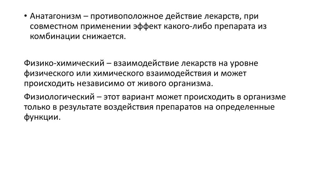 • Анатагонизм – противоположное действие лекарств, присовместном применении эффект какого-либо препарата из