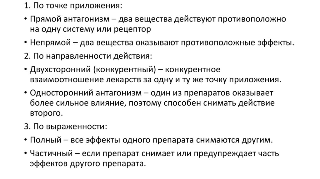 1. По точке приложения:• Прямой антагонизм – два вещества действуют противоположно