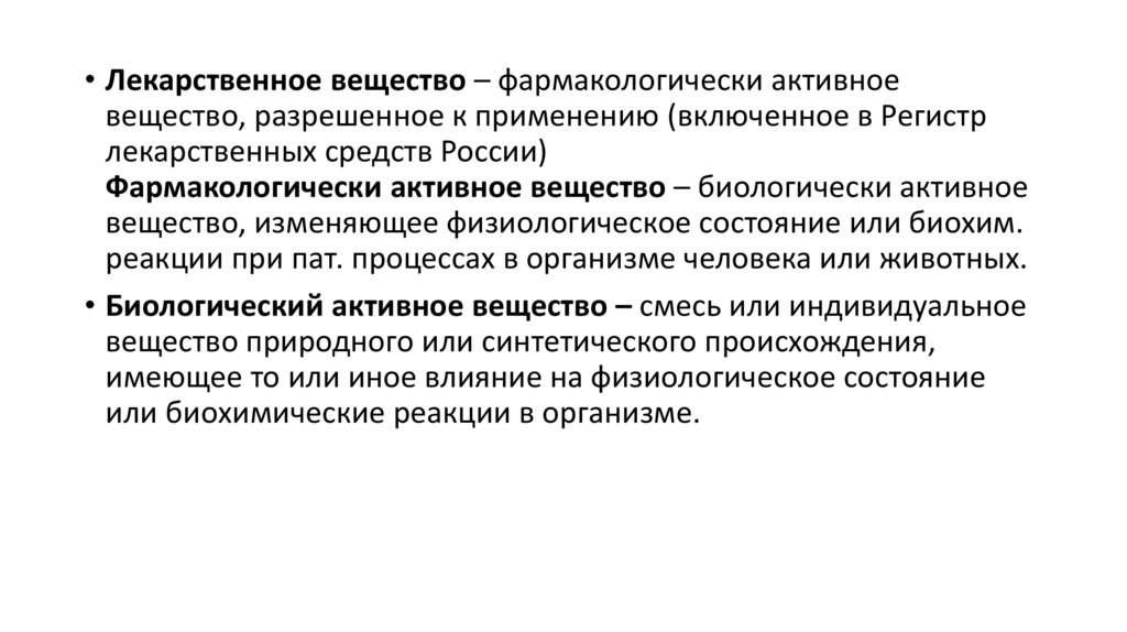 • Лекарственное вещество – фармакологически активноевещество, разрешенное к применению (включенное в Регистр