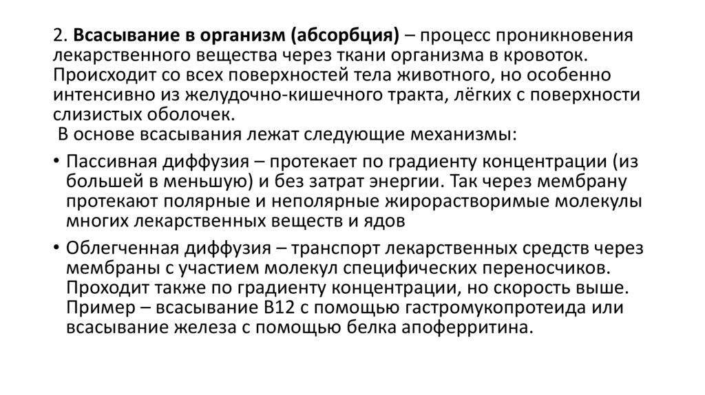 2. Всасывание в организм (абсорбция) – процесс проникновениялекарственного вещества через ткани организма в кровоток.