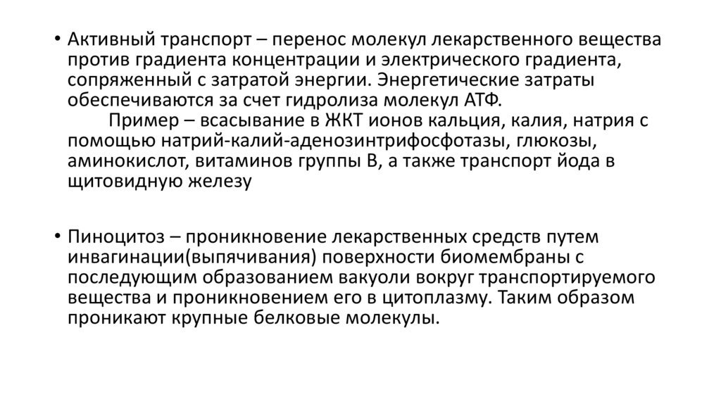 • Активный транспорт – перенос молекул лекарственного веществапротив градиента концентрации и электрического градиента,