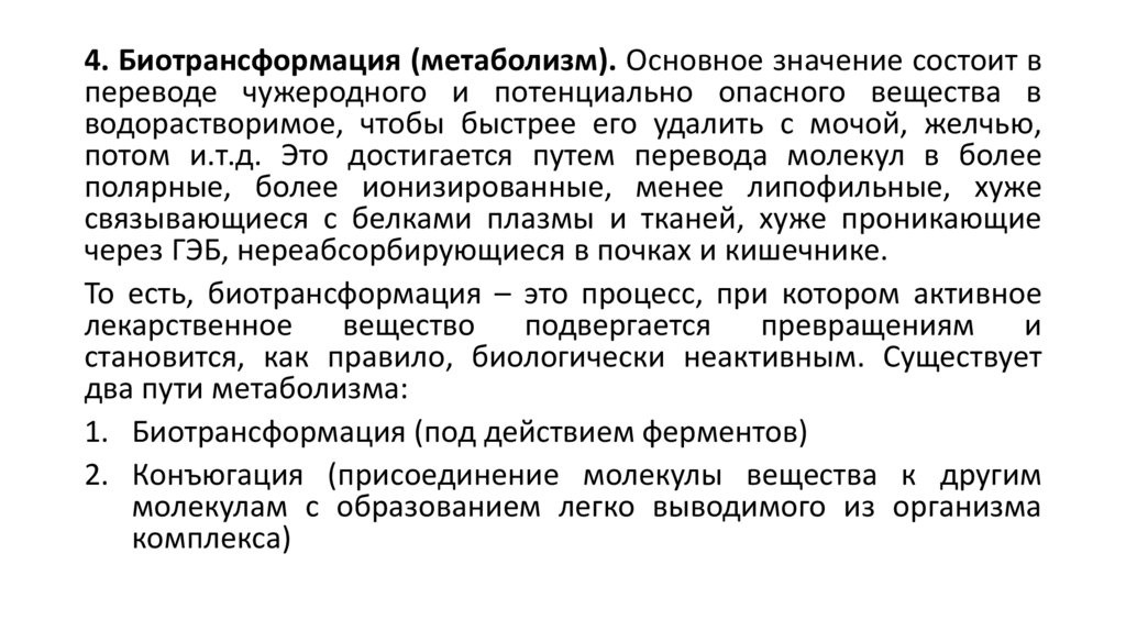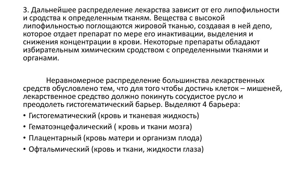 3. Дальнейшее распределение лекарства зависит от его липофильностии сродства к определенным тканям. Вещества с высокой