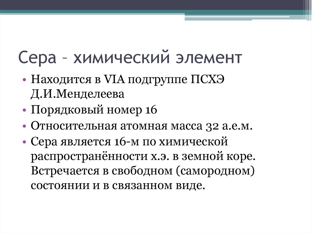 Сера – химический элемент• Находится в VIA подгруппе ПСХЭ