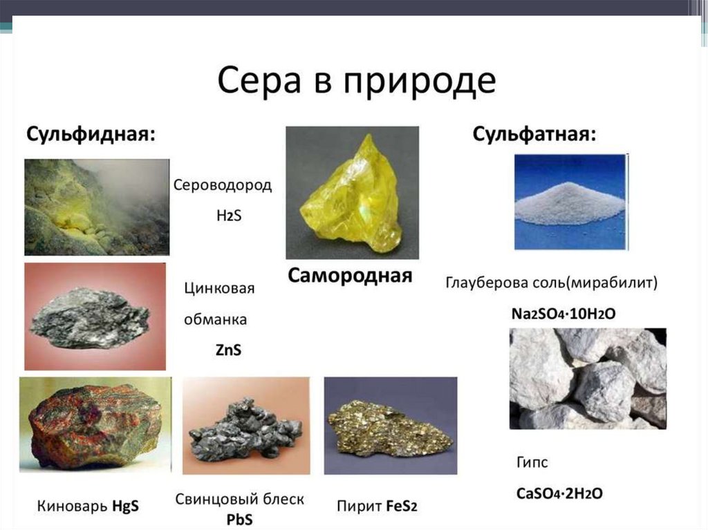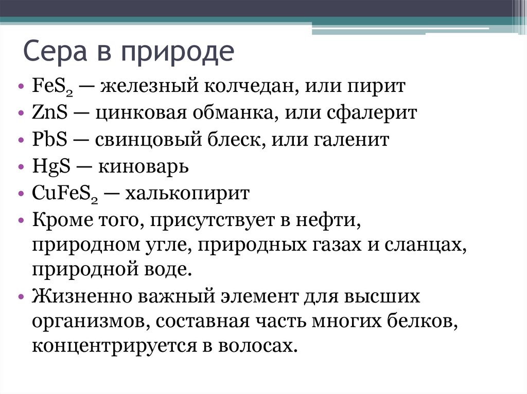 Сера в природе• FeS2 — железный колчедан, или пирит