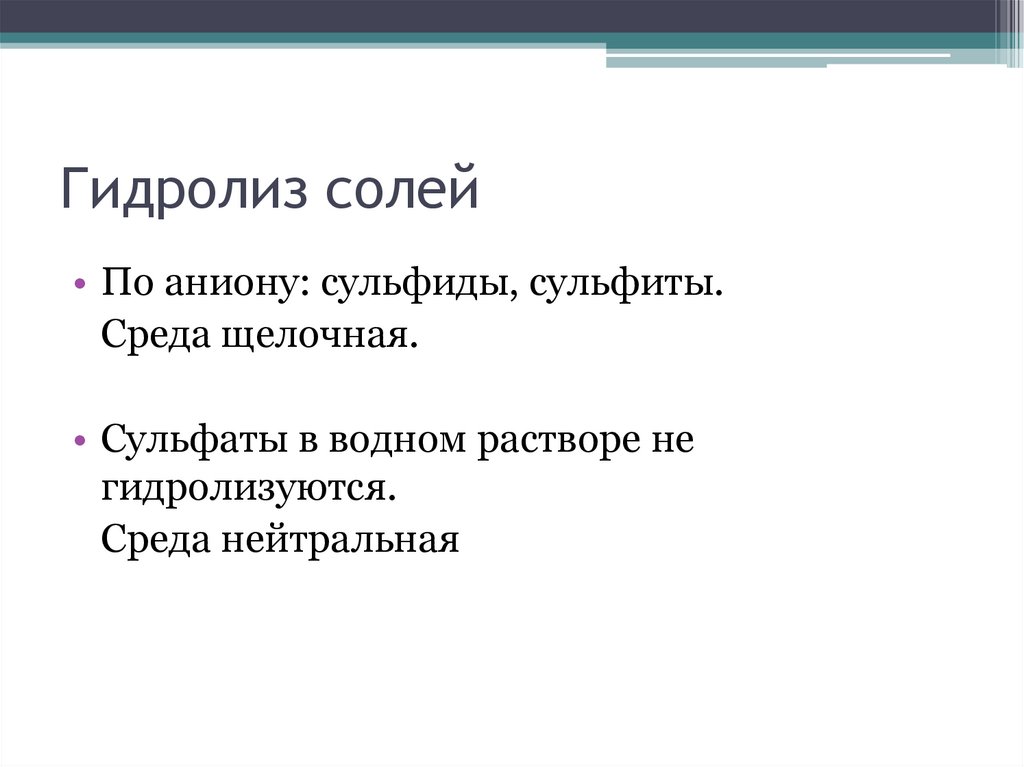 Гидролиз солей• По аниону: сульфиды, сульфиты.