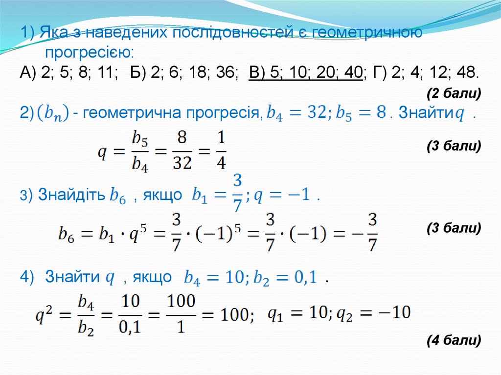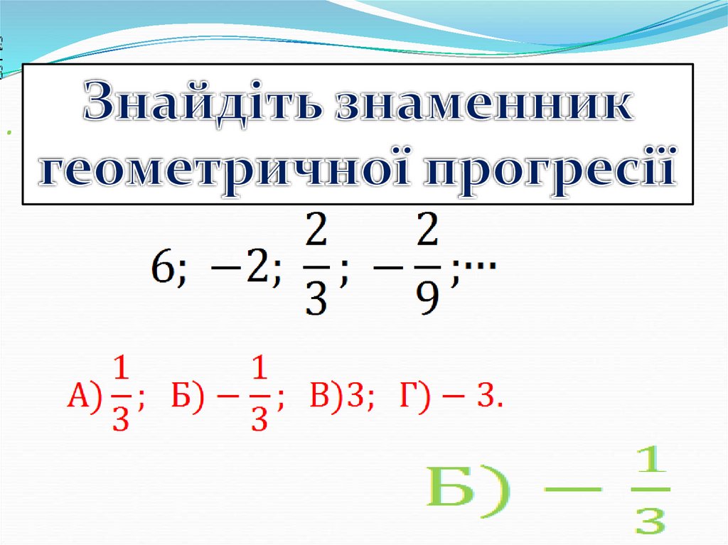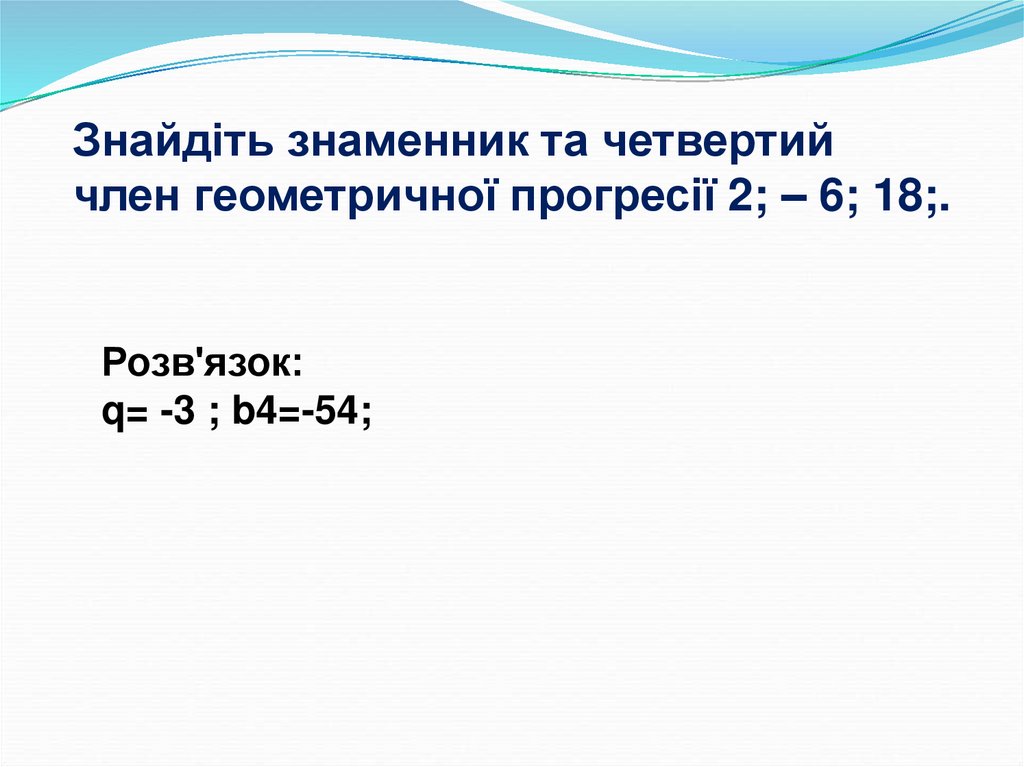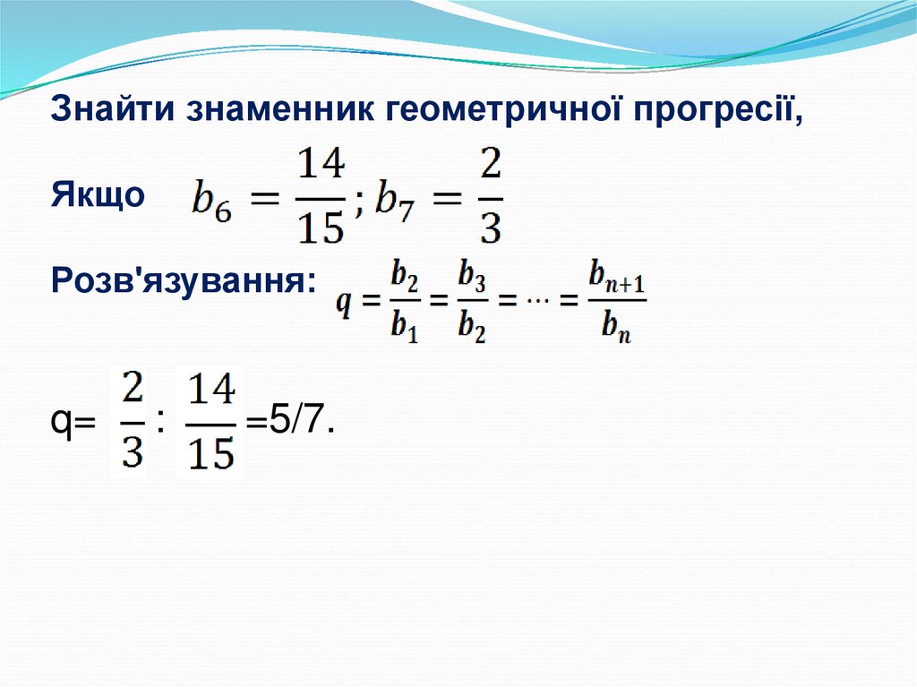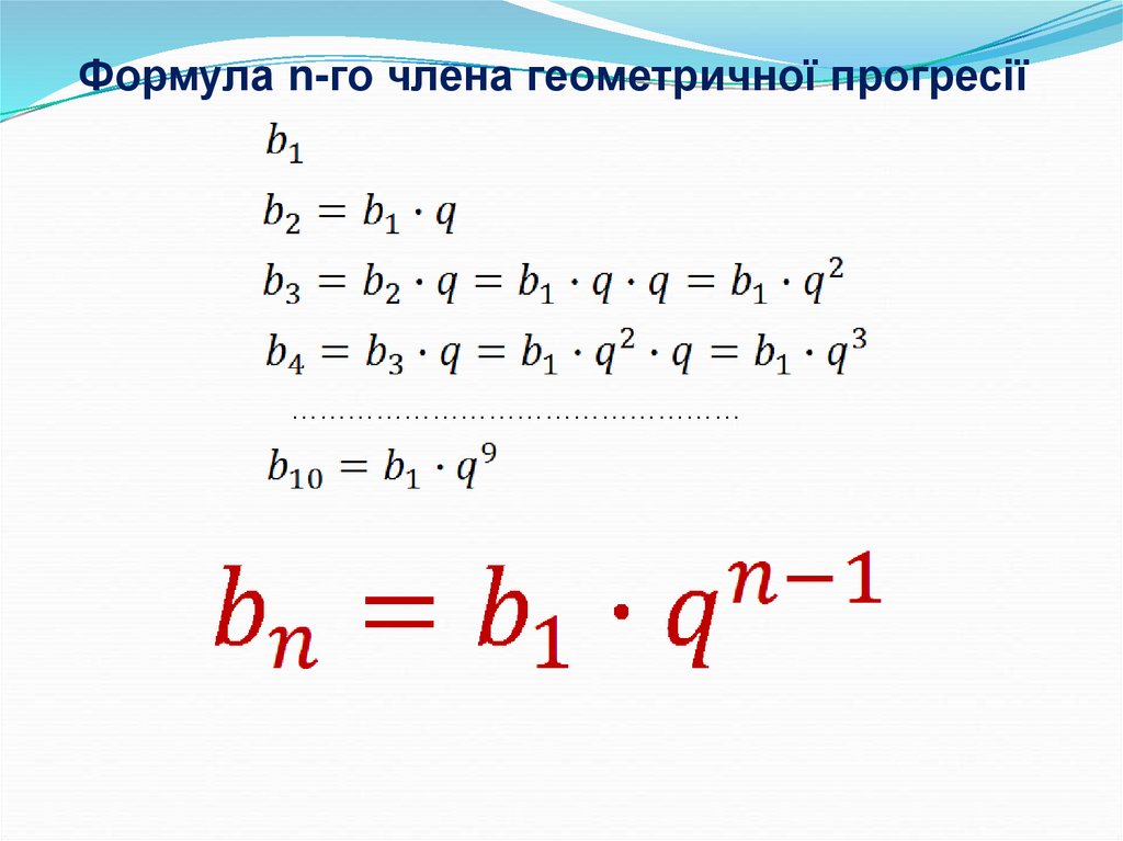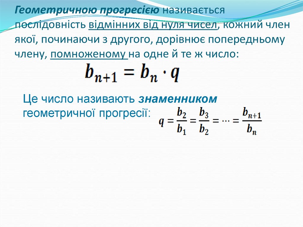 2. Геометричною прогресією називається послідовність відмінних від нуля чисел, кожний член якої, починаючи з другого, дорівнює