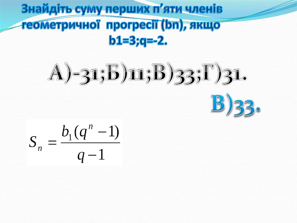 15. Знайдіть суму перших п’яти членів геометричної прогресії (bn), якщо b1=3;q=-2.