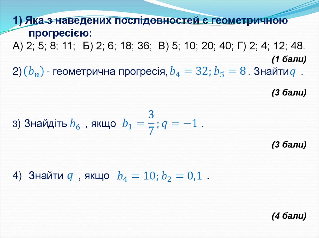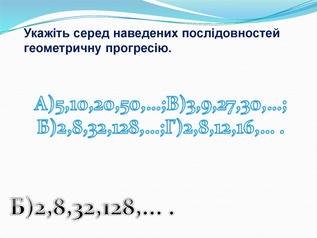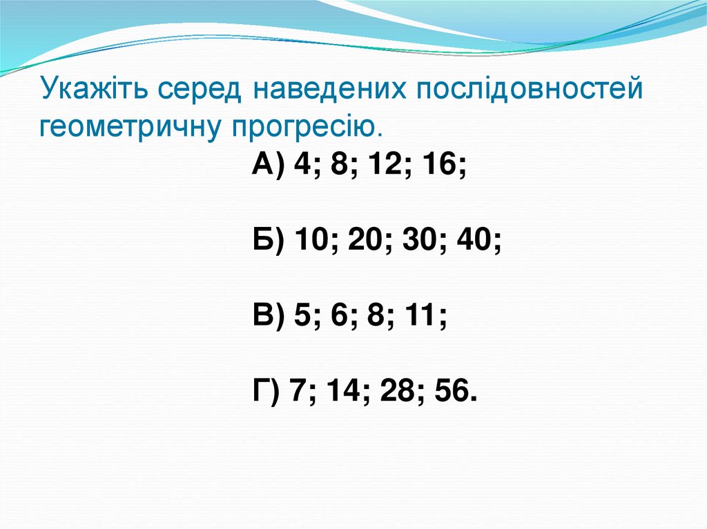 1) Яка з наведених послідовностей є геометричноюпрогресією: