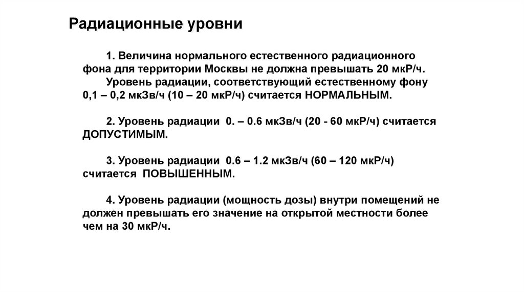 2. Уровень радиации 0. – 0.6 мкЗв/ч (20 - 60 мкР/ч) считается