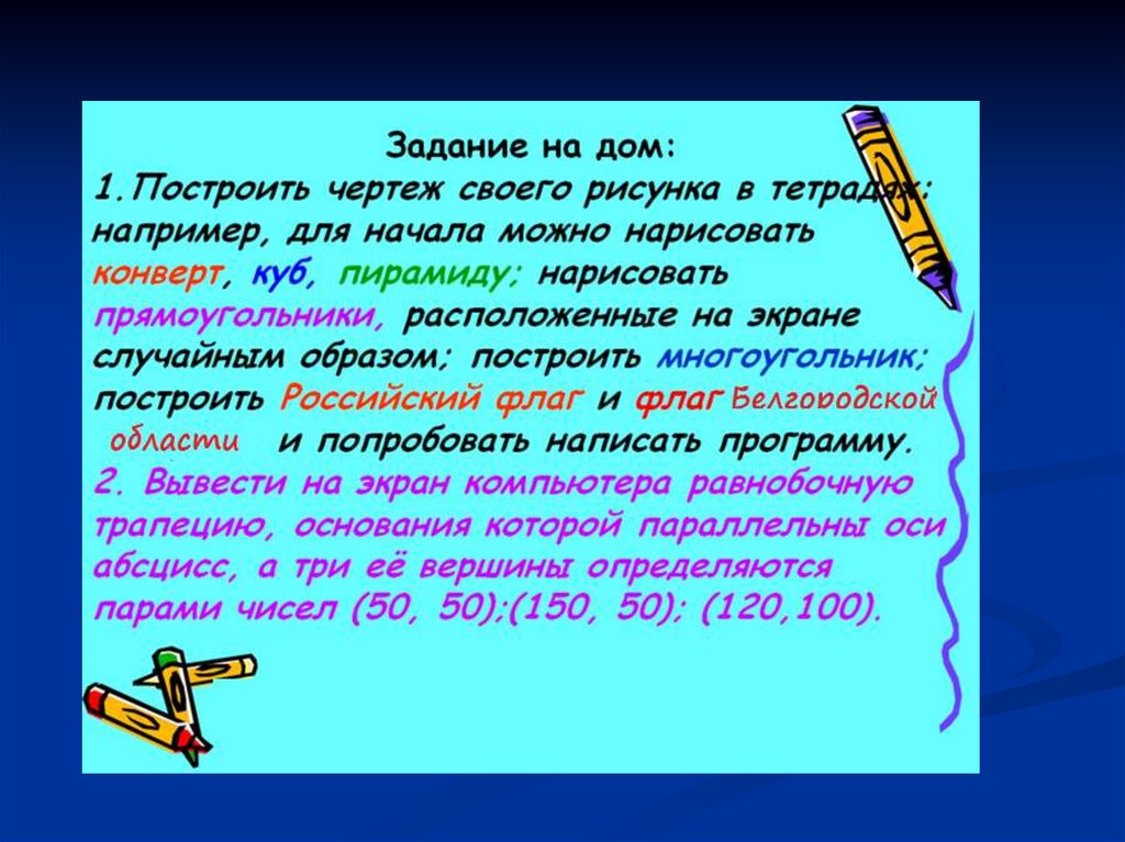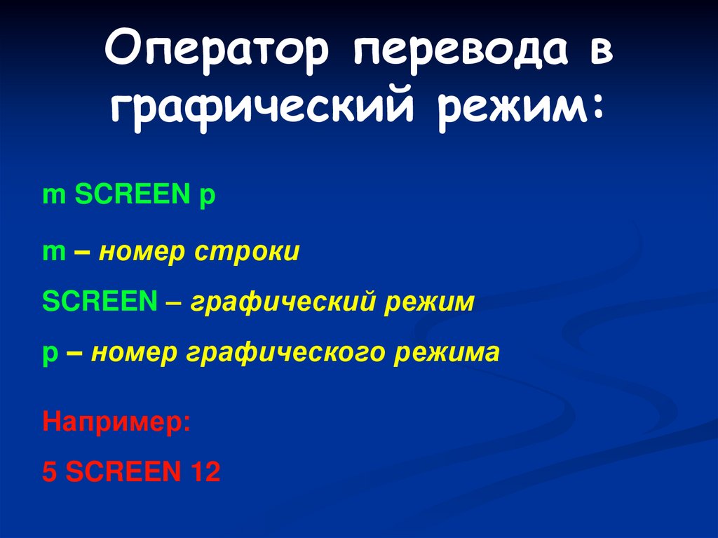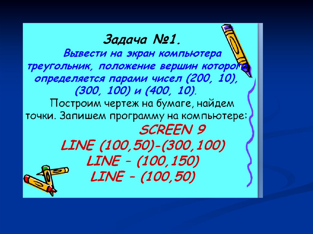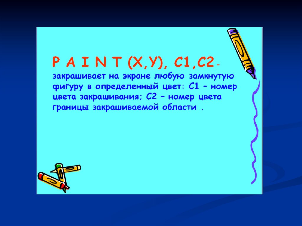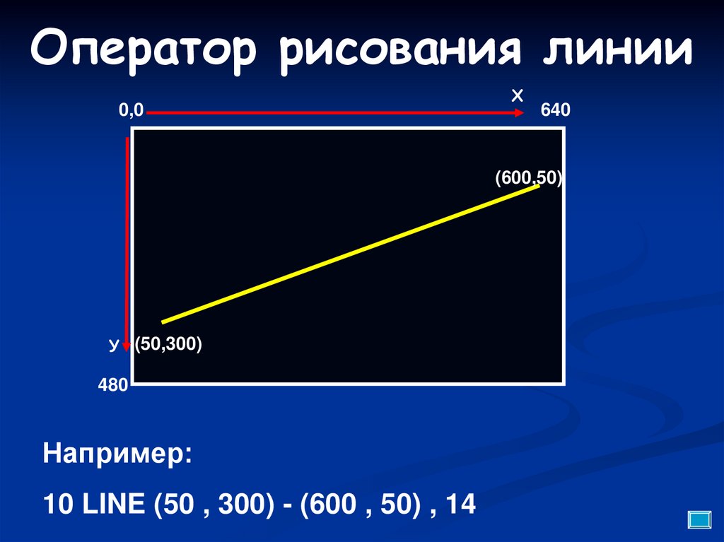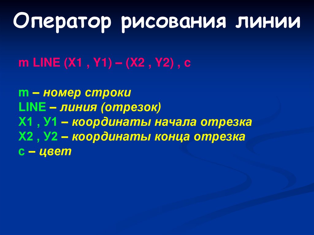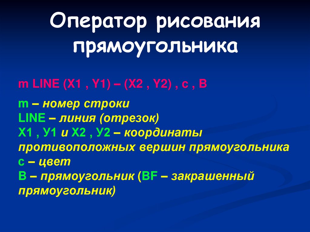 Оператор рисования линииm LINE (X1 , Y1) – (X2 , Y2) , c