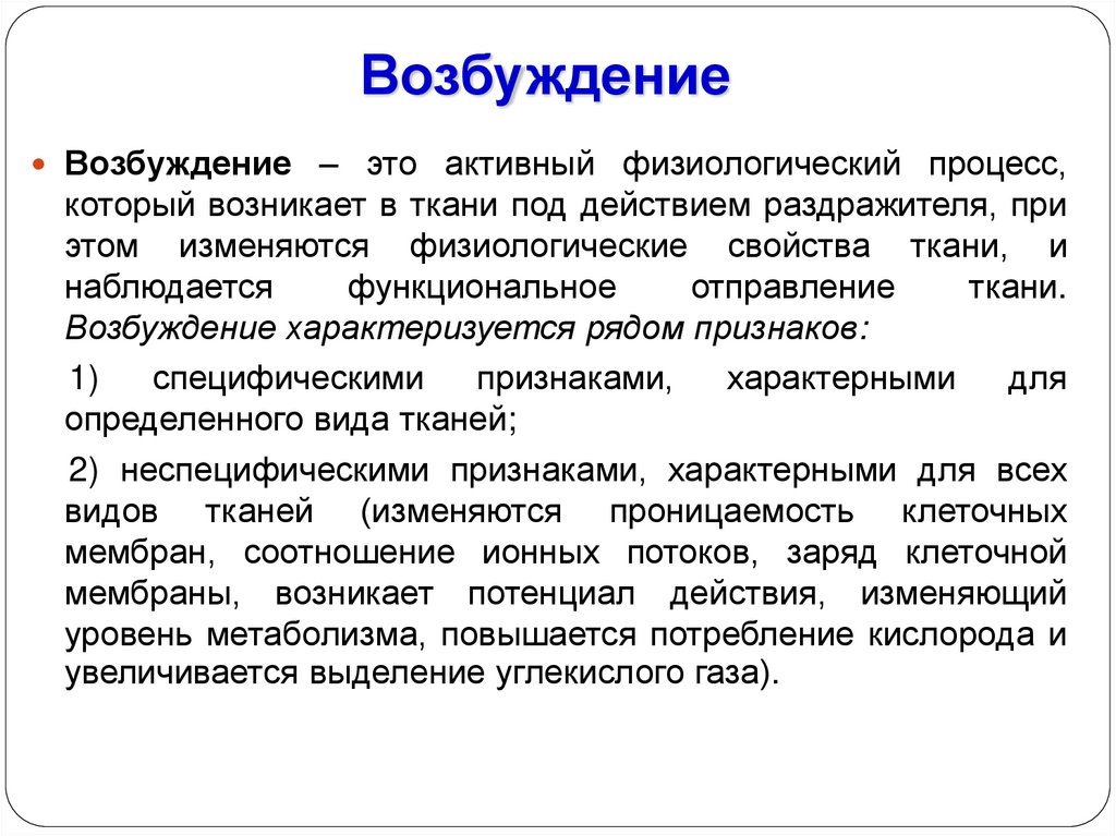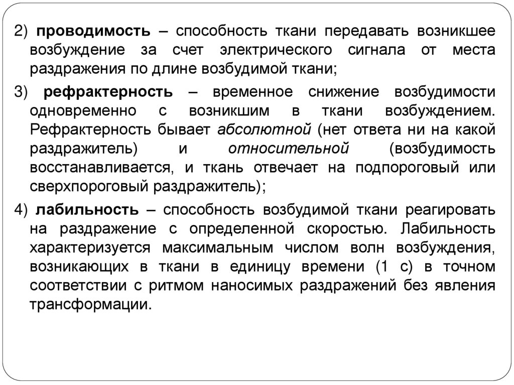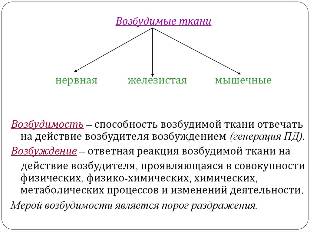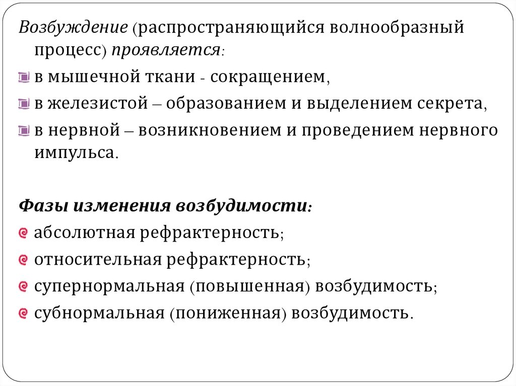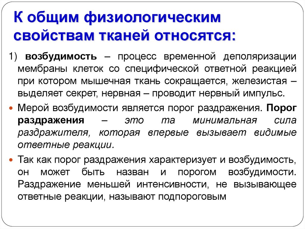 1) возбудимость – процесс временной деполяризациимембраны клеток со специфической ответной реакцией