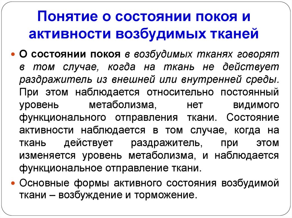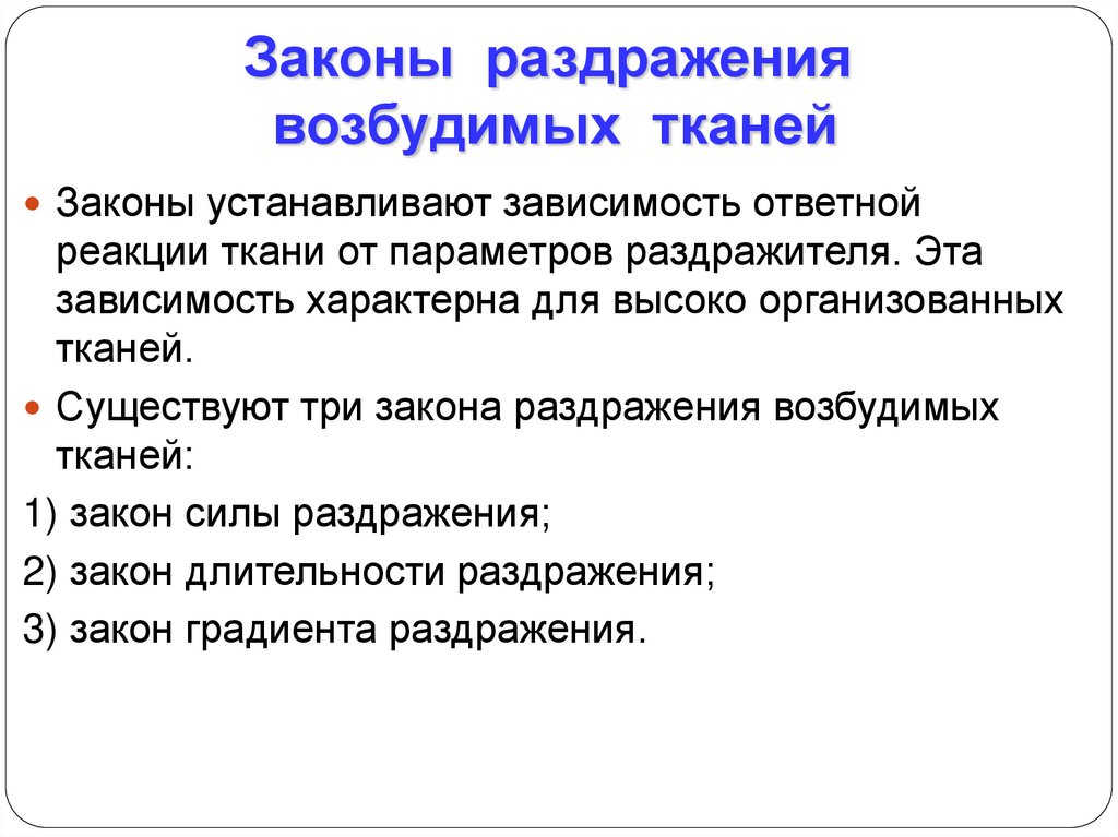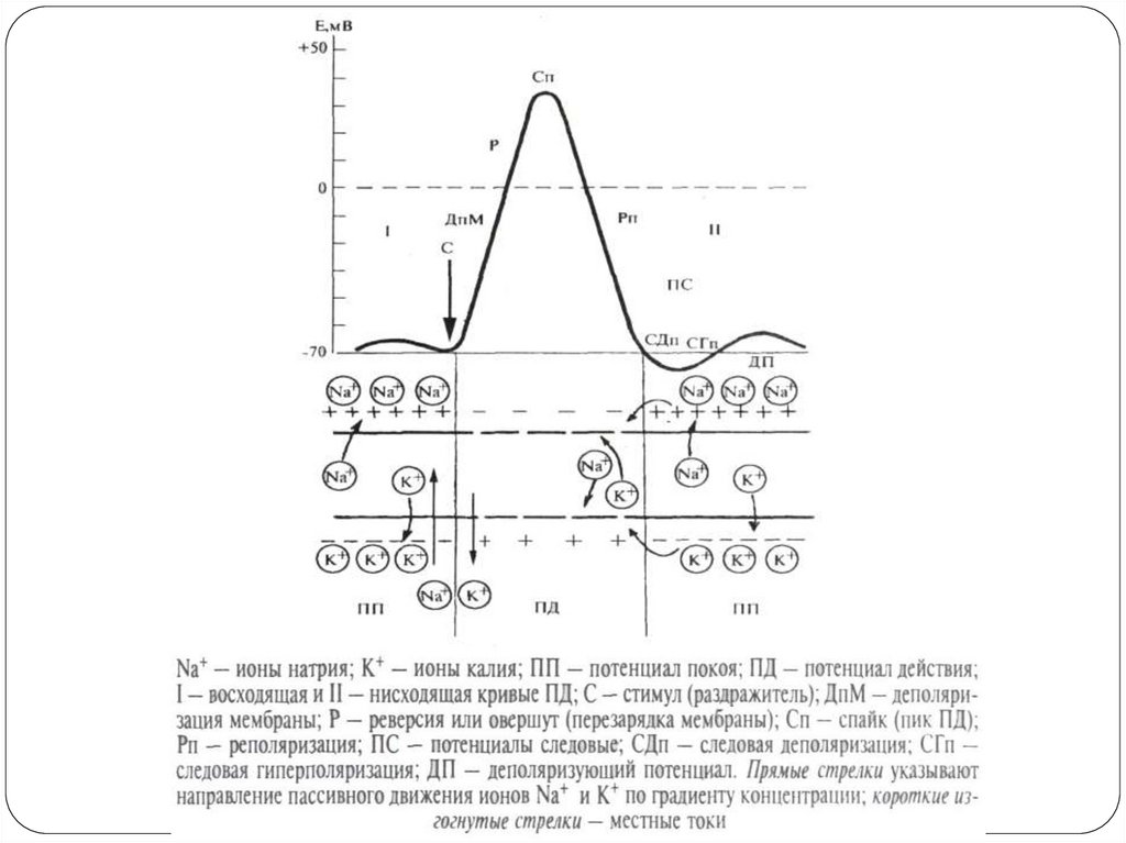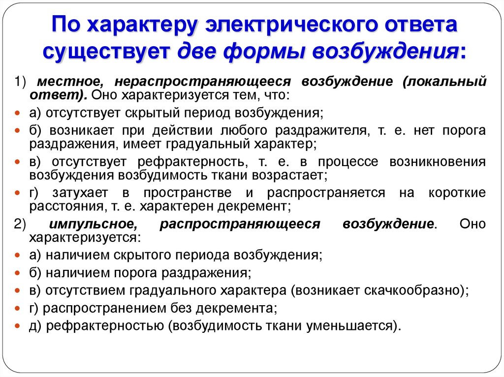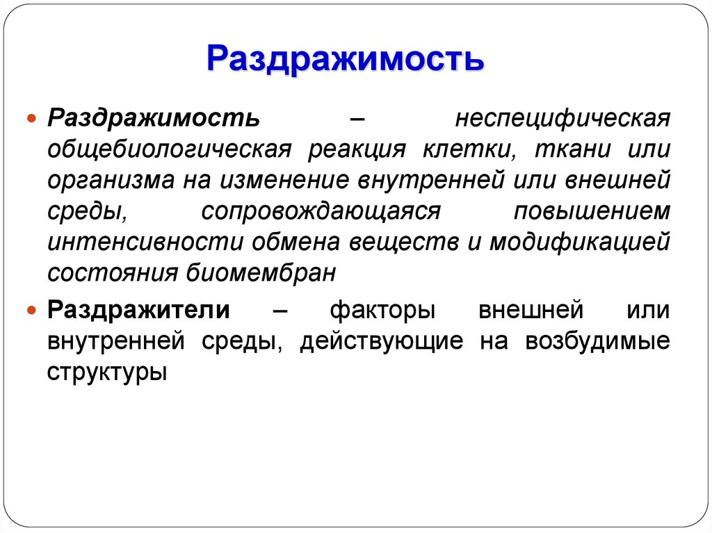 1) возбудимость – процесс временной деполяризациимембраны клеток со специфической ответной реакцией