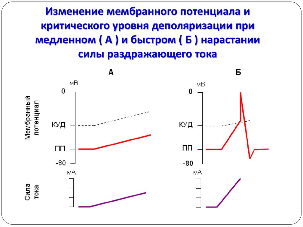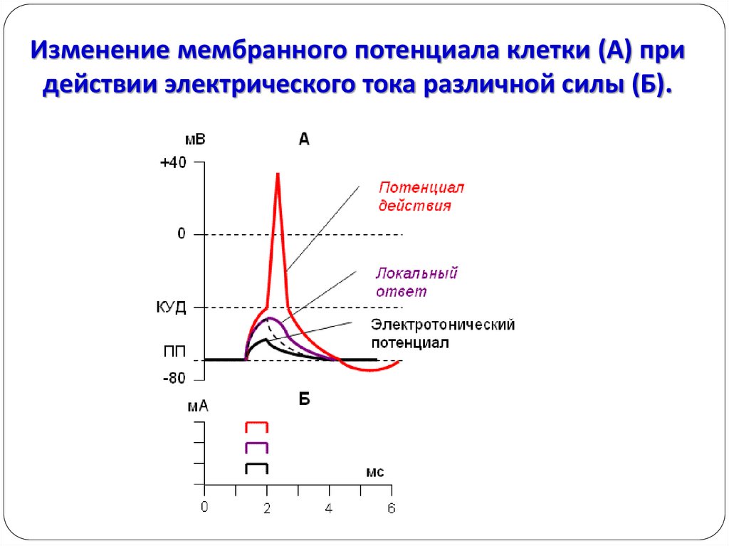 27. Изменение мембранного потенциала клетки (А) при действии электрического тока различной силы (Б).