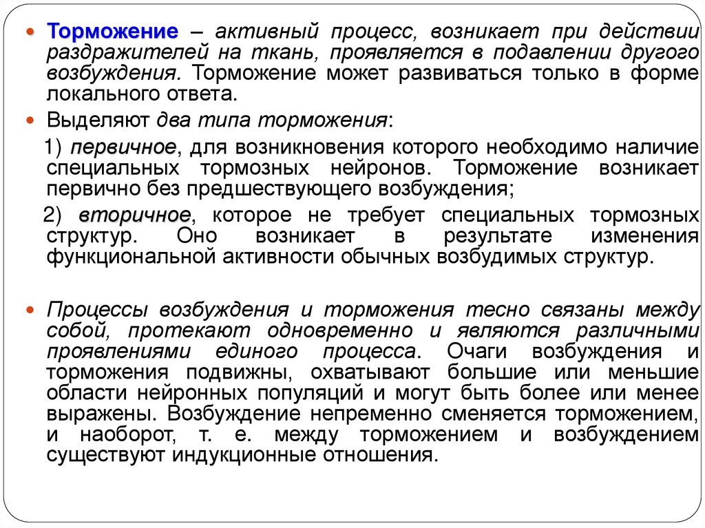 Торможение – активный процесс, возникает при действиираздражителей на ткань, проявляется в подавлении другого