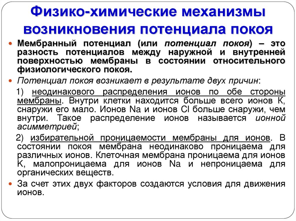 Мембранный потенциал (или потенциал покоя) – эторазность потенциалов между наружной и внутренней