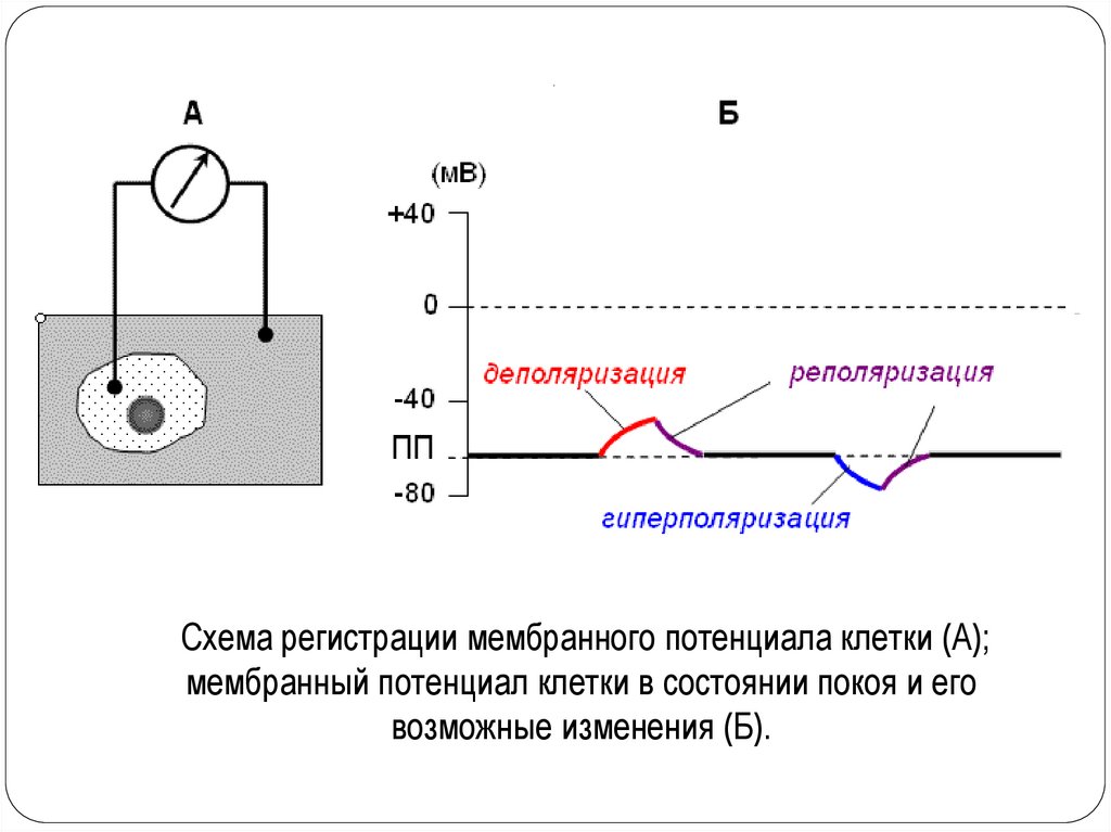 Схема регистрации мембранного потенциала клетки (А);мембранный потенциал клетки в состоянии покоя и его
