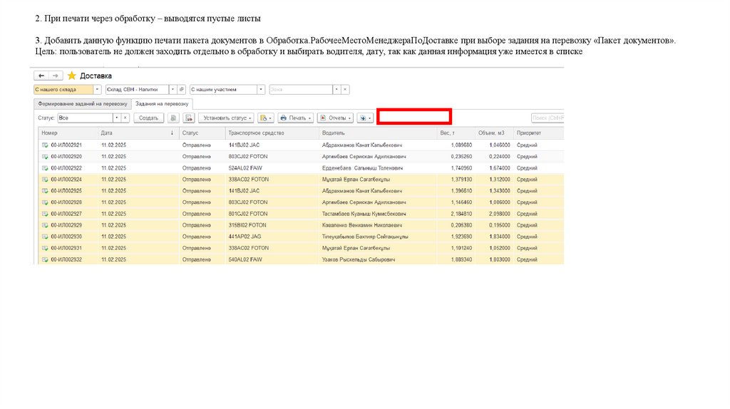 2. При печати через обработку – выводятся пустые листы3. Добавить данную функцию печати пакета документов в Обработка.РабочееМестоМенеджераПоДоставке при выборе задания на перевозку «Пакет документов».