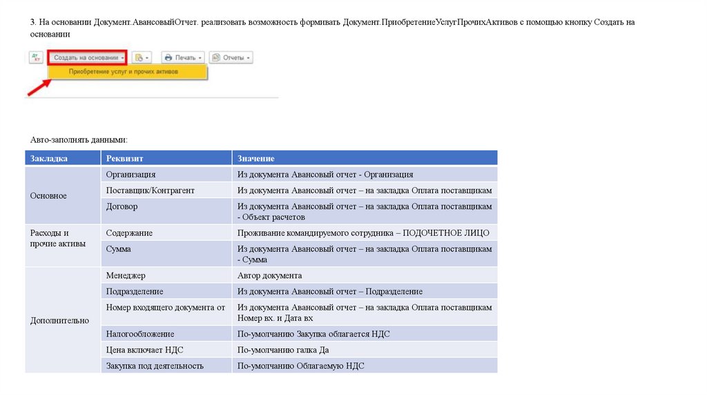 3. На основании Документ.АвансовыйОтчет. реализовать возможность формивать Документ.ПриобретениеУслугПрочихАктивов с помощью кнопку Создать наосновании