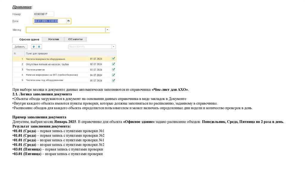 Прототип:При выборе месяца в документе данные автоматически заполняются из справочника «Чек-лист для АХО».