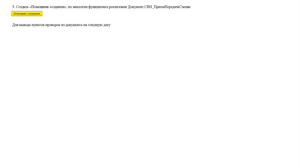 3. Создать «Помощник создания», по аналогии функционал реализован Документ.СВН_ПриемПередачаСменыДля вывода пунктов проверок из документа на текущую дату