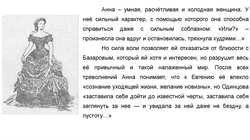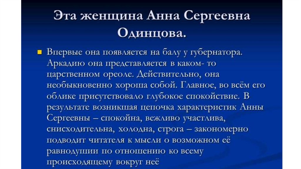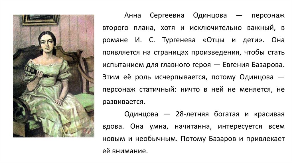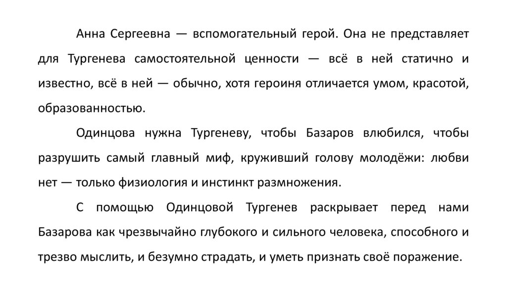 Анна Сергеевна — вспомогательный герой. Она не представляетдля Тургенева самостоятельной ценности — всё в ней статично и