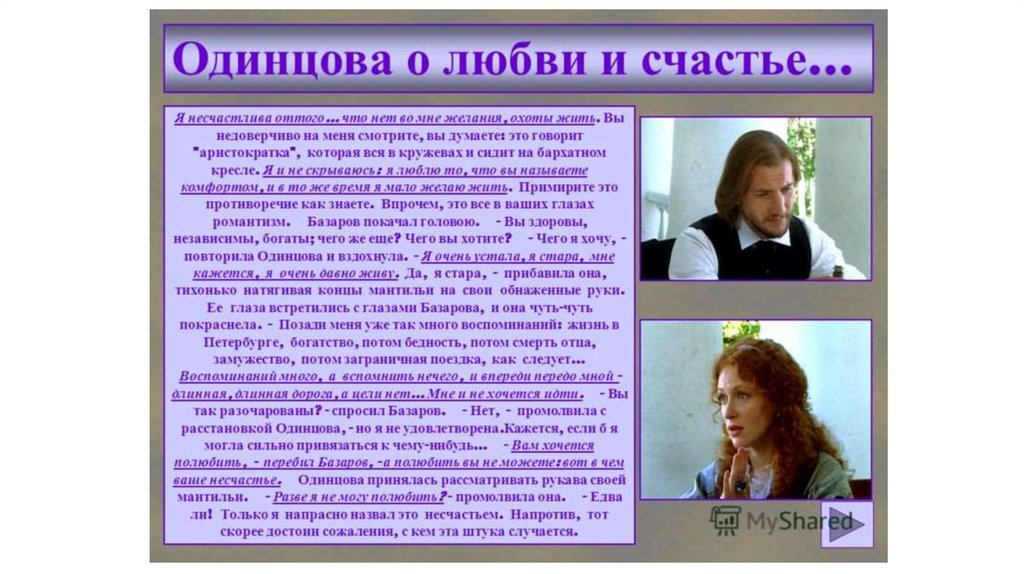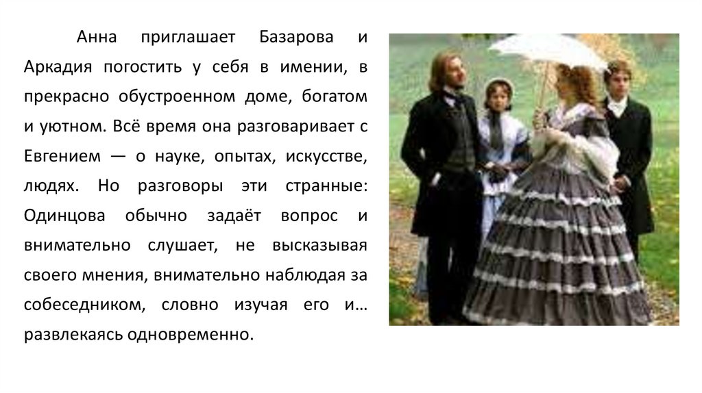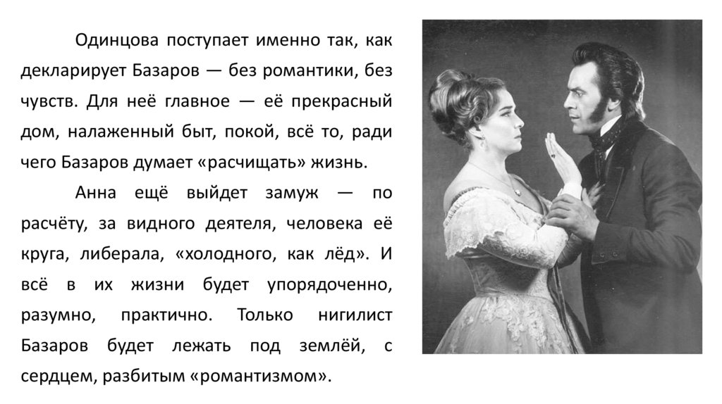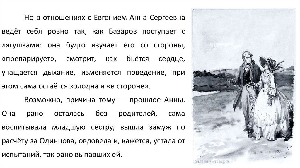 Но в отношениях с Евгением Анна Сергеевнаведёт себя ровно так, как Базаров поступает с