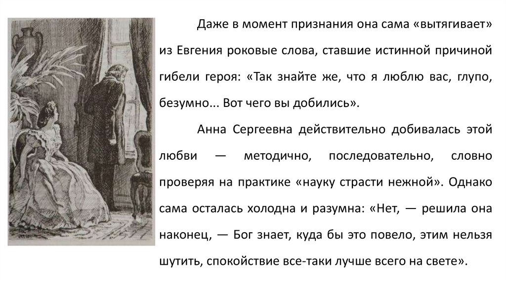 Даже в момент признания она сама «вытягивает»из Евгения роковые слова, ставшие истинной причиной