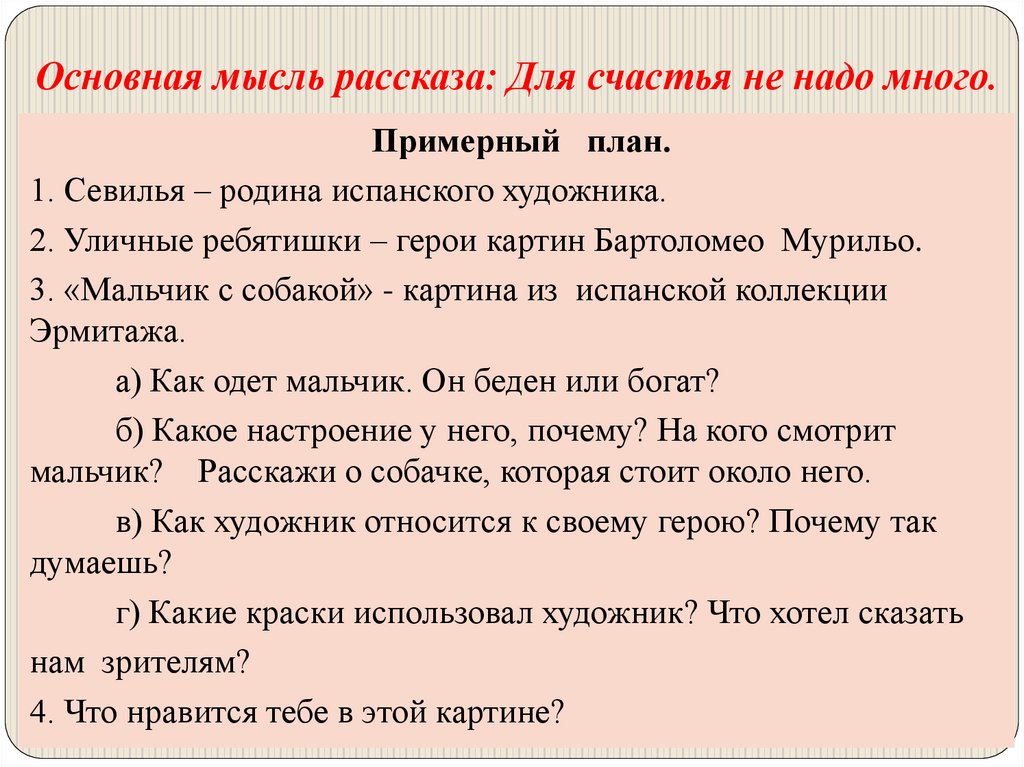 Основная мысль рассказа: Для счастья не надо много.Примерный план.