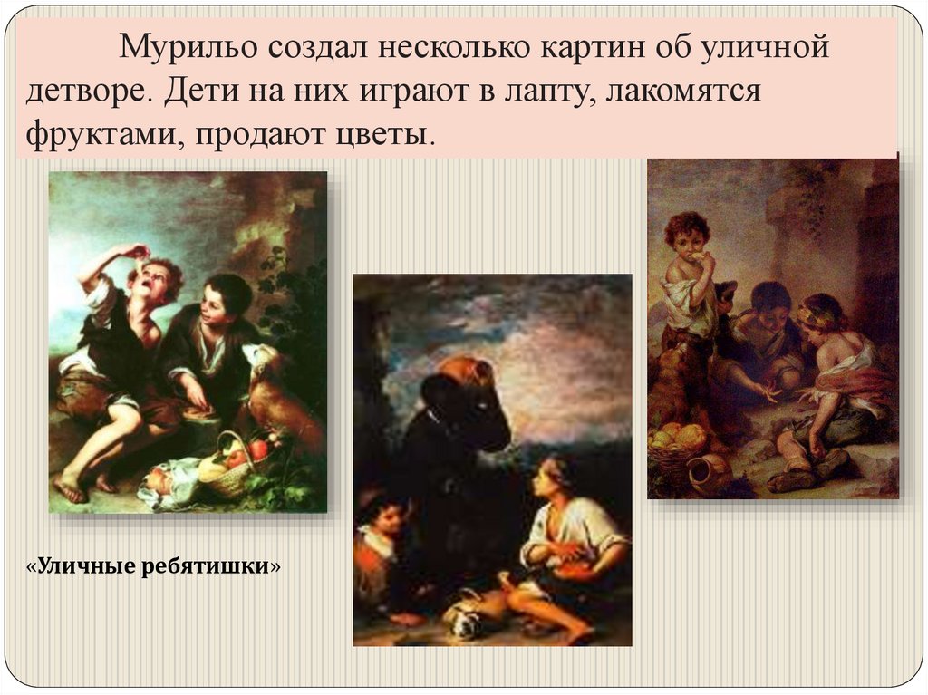 Мурильо создал несколько картин об уличнойдетворе. Дети на них играют в лапту, лакомятся