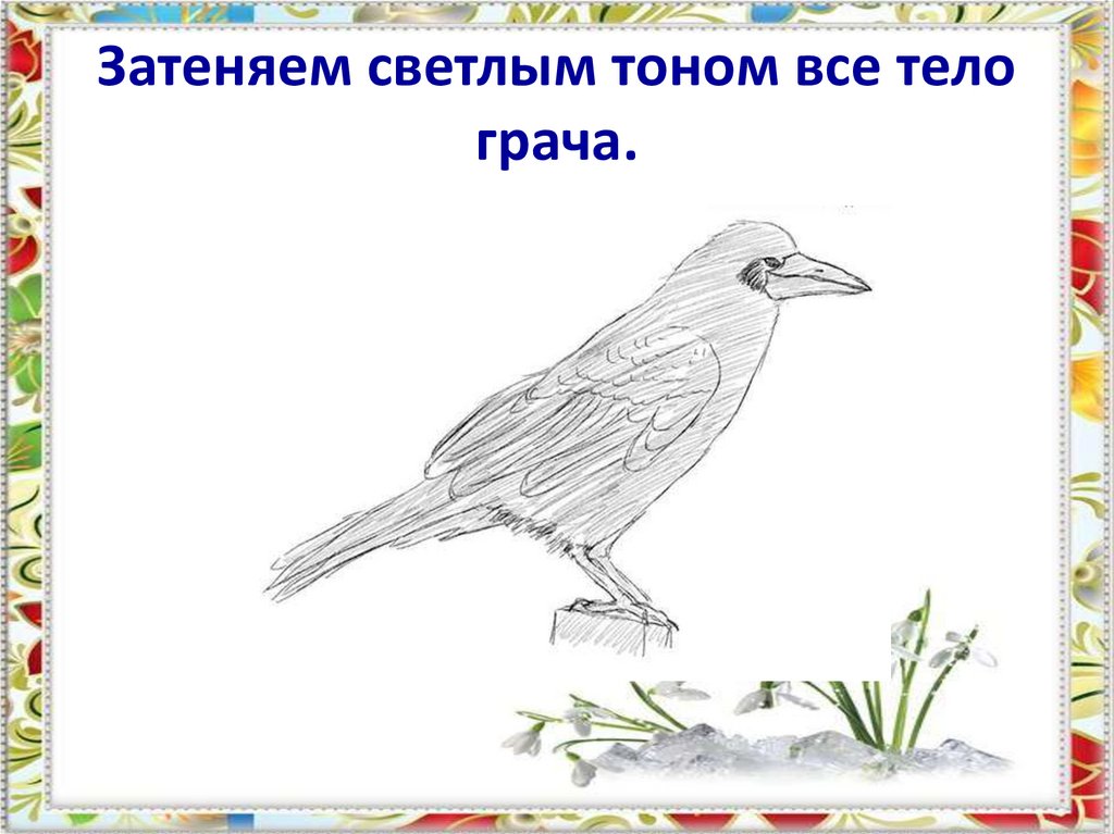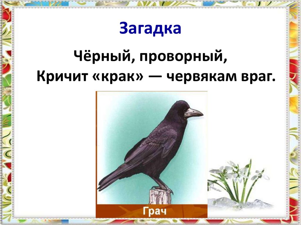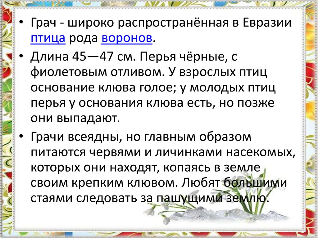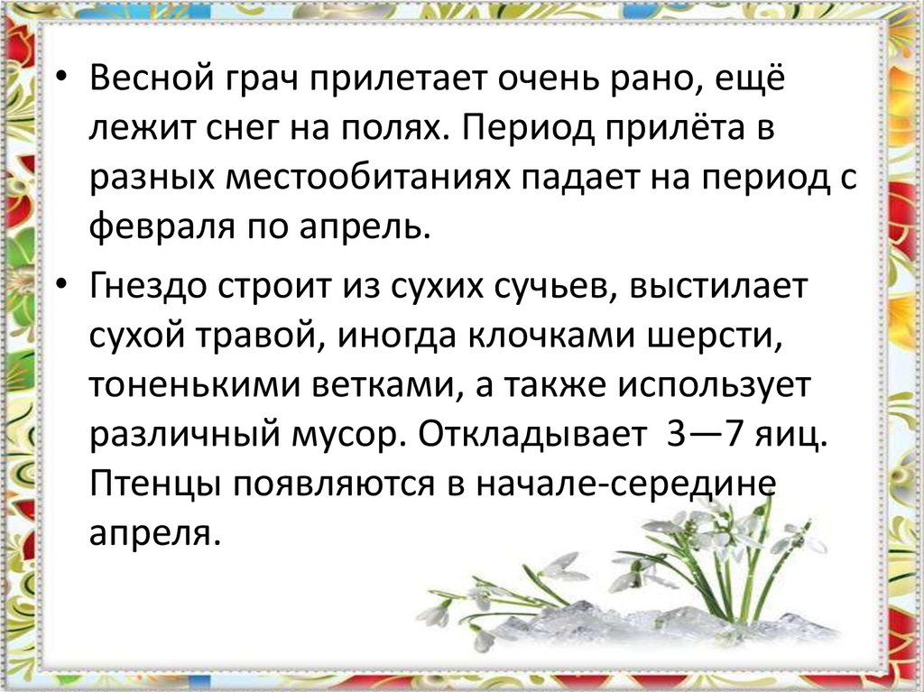 • Весной грач прилетает очень рано, ещёлежит снег на полях. Период прилёта в