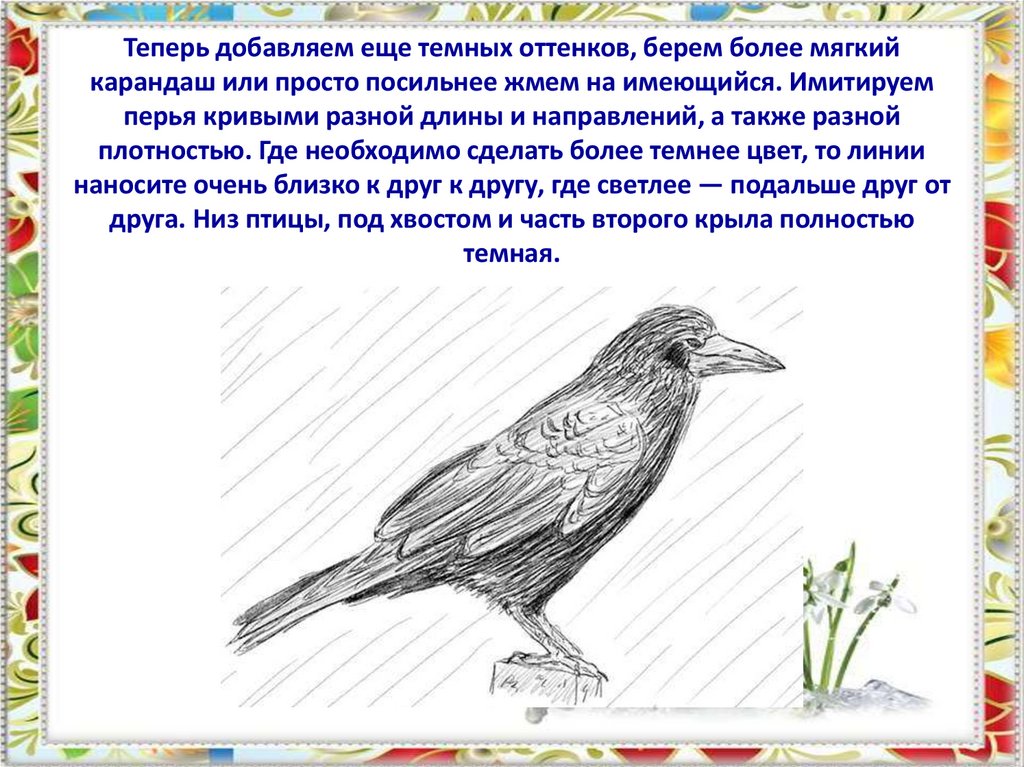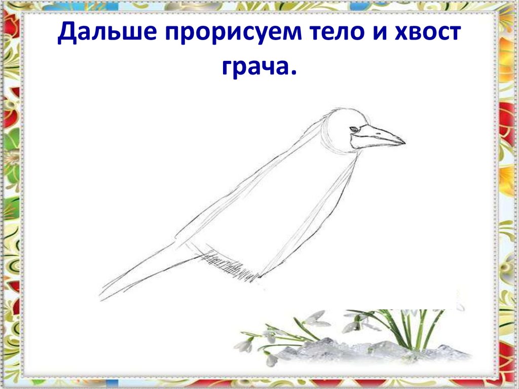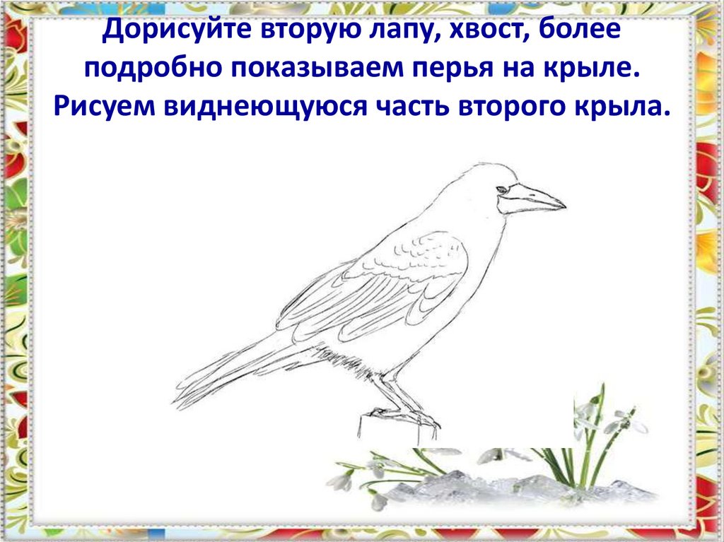 Дорисуйте вторую лапу, хвост, болееподробно показываем перья на крыле.