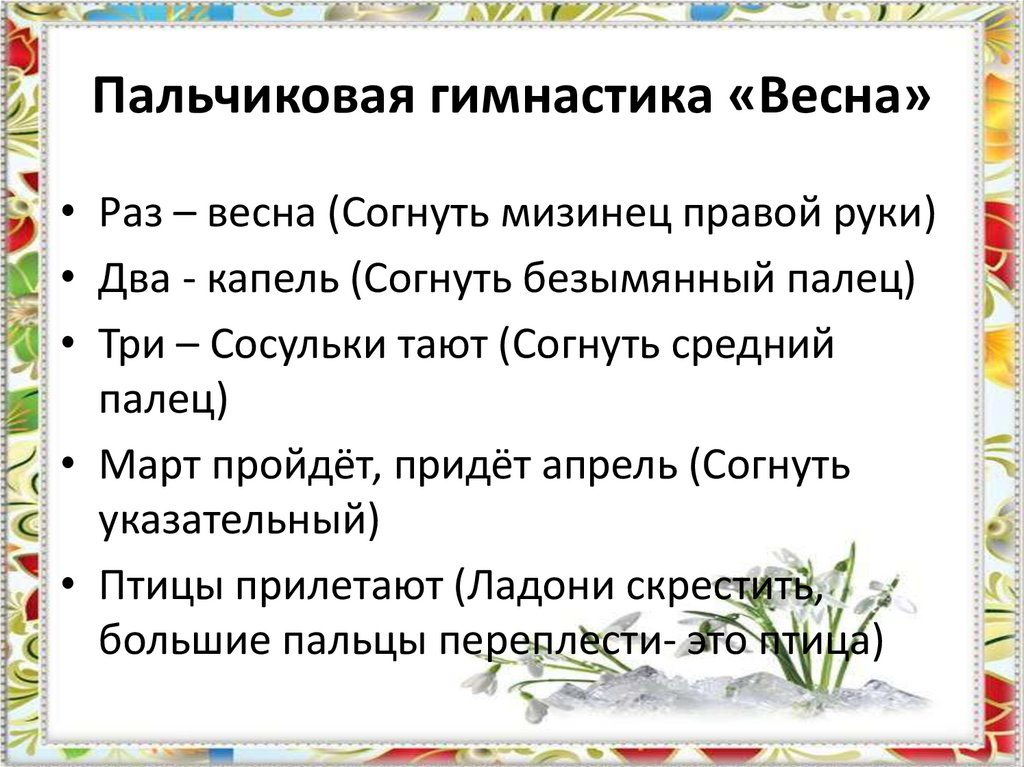Пальчиковая гимнастика «Весна»• Раз – весна (Согнуть мизинец правой руки)