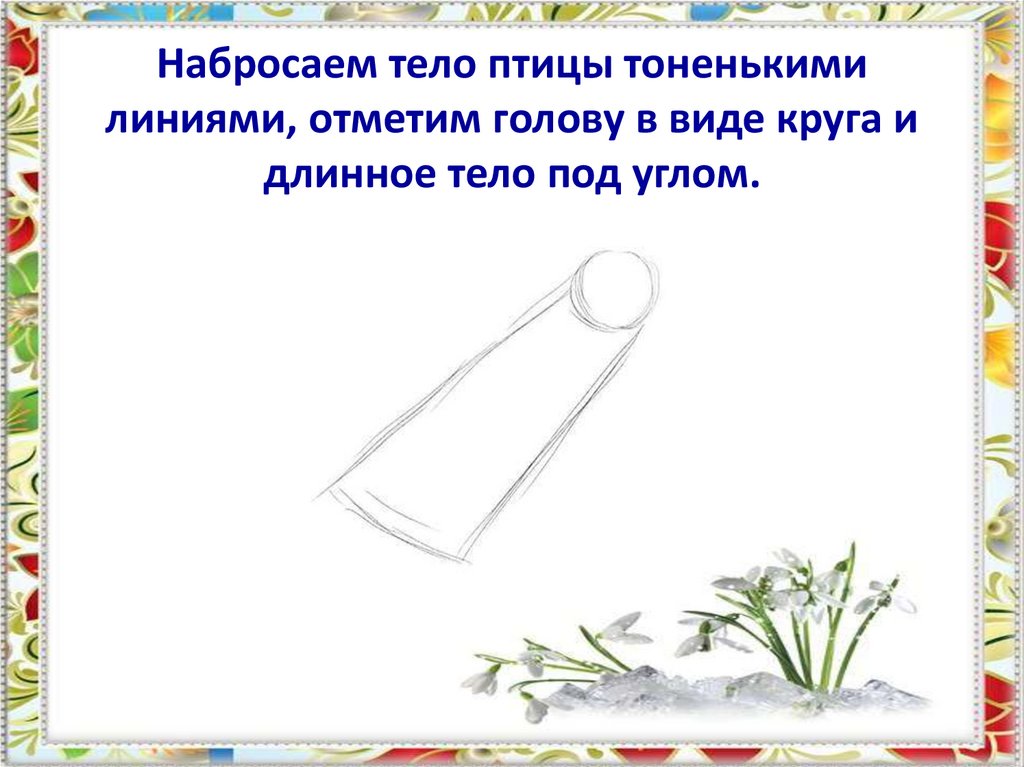 Набросаем тело птицы тоненькимилиниями, отметим голову в виде круга и