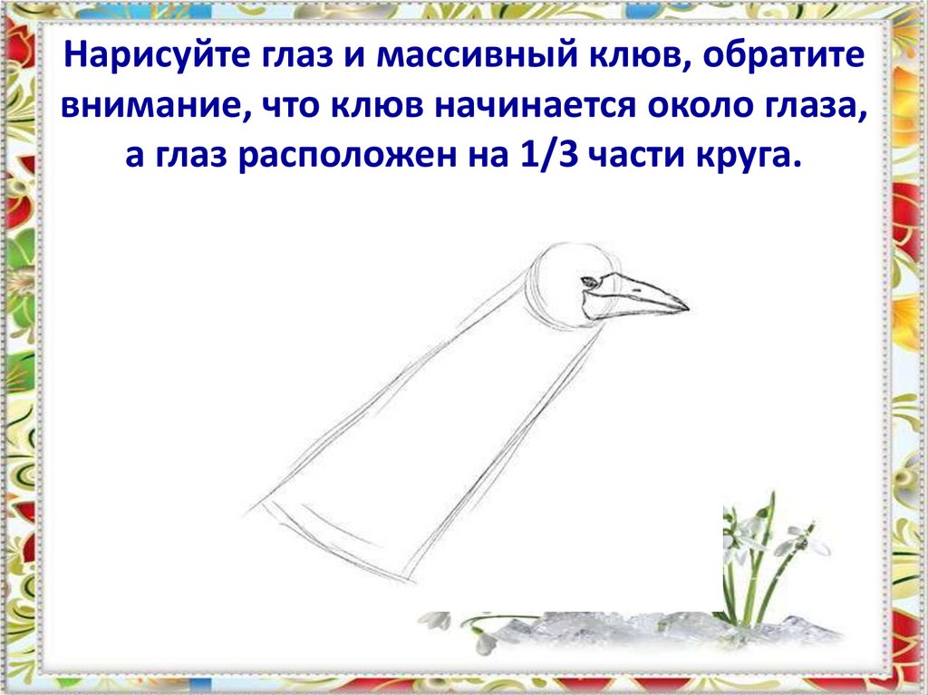 Нарисуйте глаз и массивный клюв, обратитевнимание, что клюв начинается около глаза,
