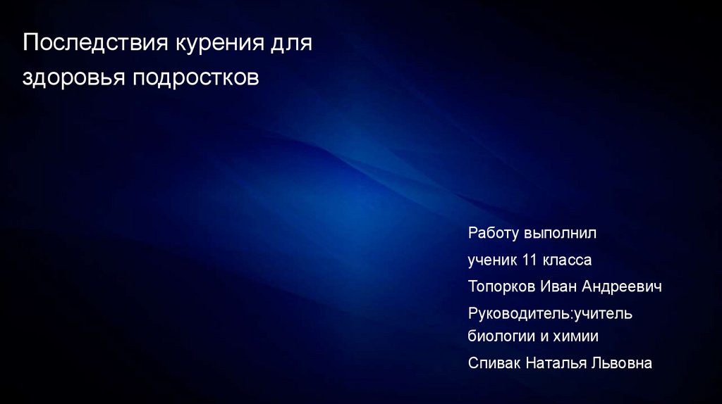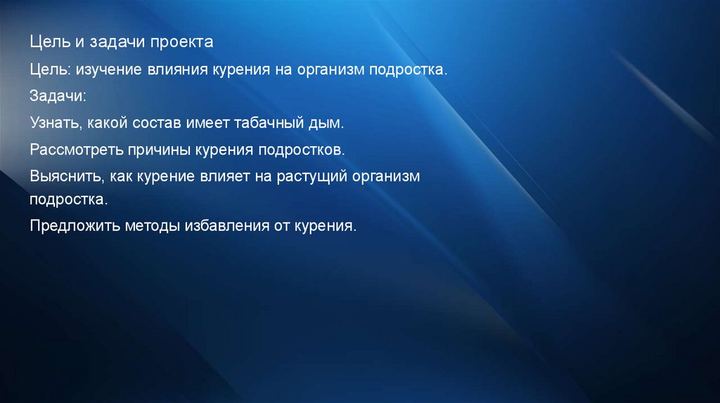 Цель и задачи проектаЦель: изучение влияния курения на организм подростка.