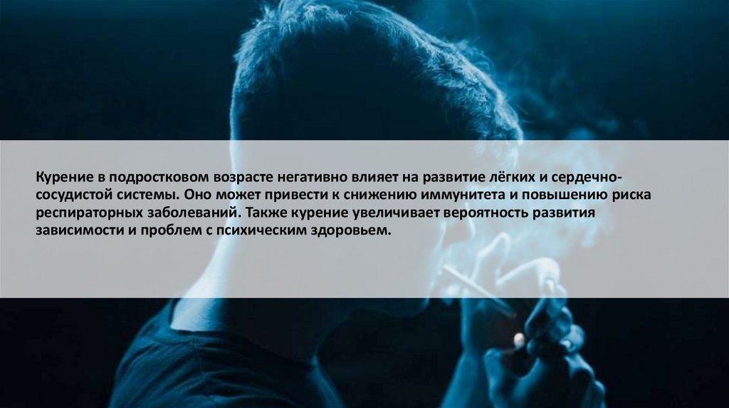 Курение в подростковом возрасте негативно влияет на развитие лёгких и сердечнососудистой системы. Оно может привести к снижению иммунитета и повышению рискареспираторных заболеваний. Также курение увеличивает вероятность развития