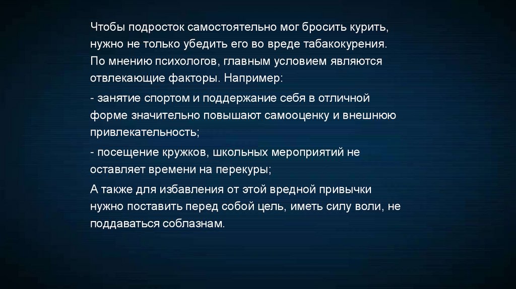 Чтобы подросток самостоятельно мог бросить курить,нужно не только убедить его во вреде табакокурения.