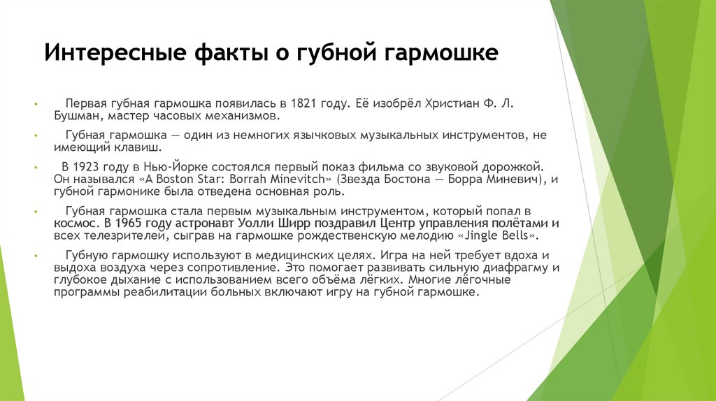Интересные факты о губной гармошкеПервая губная гармошка появилась в 1821 году. Её изобрёл Христиан Ф. Л.