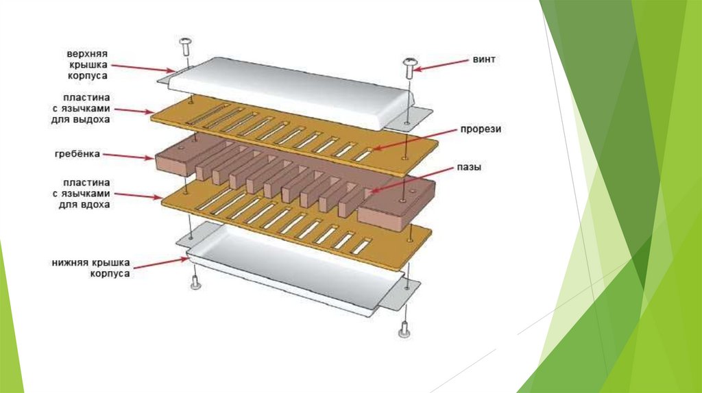 Принцип работыГубная гармоника представляет собой язычковый музыкальный инструмент, то есть
