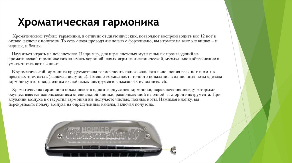 Хроматическая гармоникаХроматические губные гармоники, в отличие от диатонических, позволяют воспроизводить все 12 нот в