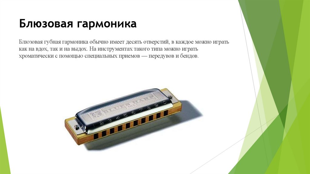 Блюзовая гармоникаБлюзовая губная гармоника обычно имеет десять отверстий, в каждое можно играть