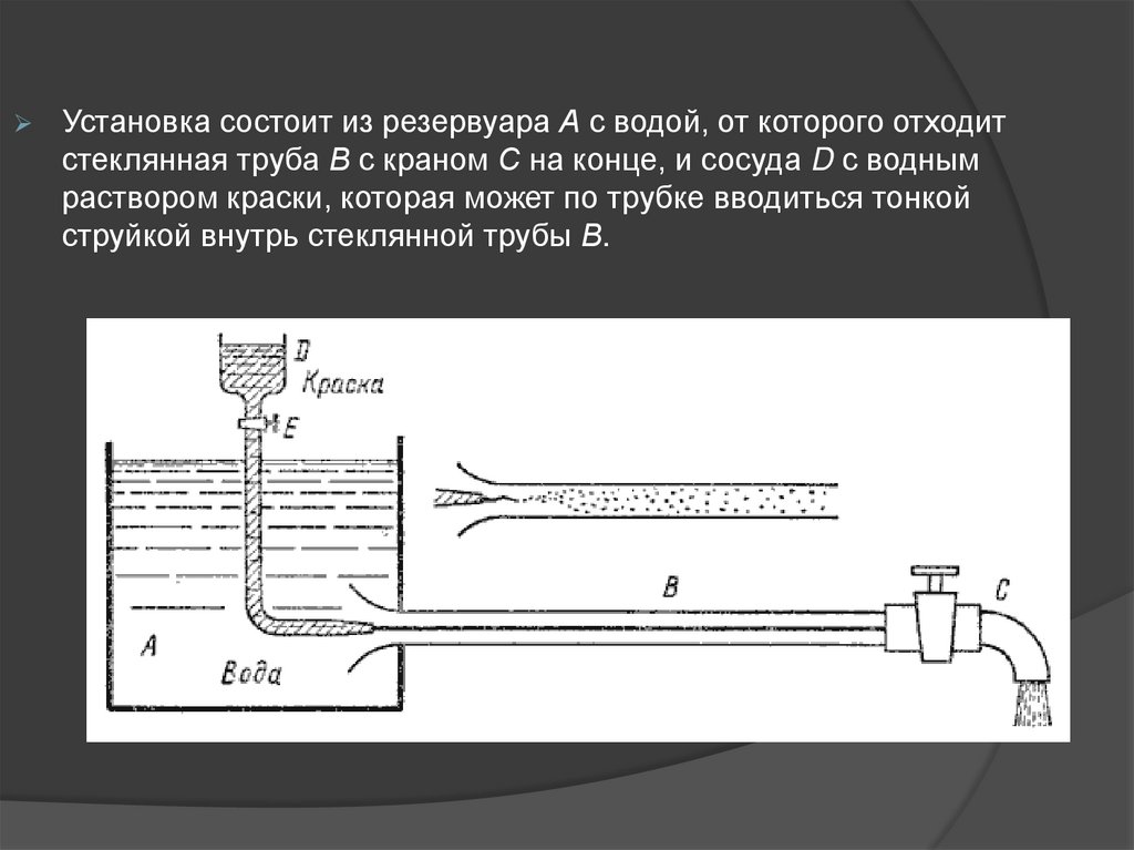 Установка состоит из резервуара А с водой, от которого отходитстеклянная труба В с краном С на конце, и сосуда D с водным